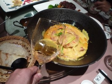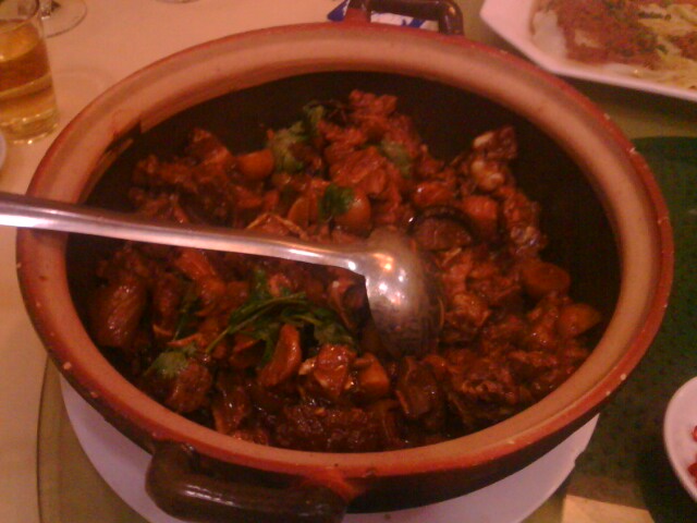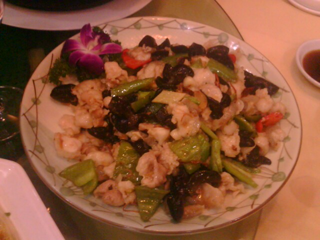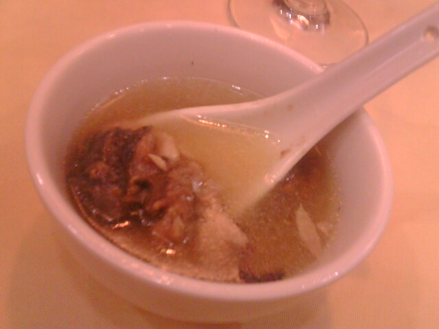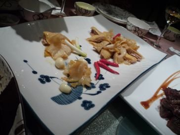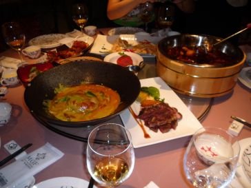 不过还是试了不少咖喱汁,印象中咖喱多少带点辣,不料这完 全不辣,应是属于改良后的广式口味了,微甜,细腻,有一股淡淡的奶油 香,嫩滑,好!喝下一羹汁,配一口葡萄酒,哈,前后呼应,还真般配。螺片捞私房鸡:又是一道改良的广味菜式,螺片爽口,鸡肉嫩滑,加上一点芥末的清香, 微辣,非常对我胃口。不过酒配起来就不如人意,甜味过浓,这是比较遗憾 的地方。海港小炒皇: 这个普通了些。果木烟熏牛扒:牛肉很嫩,但吃的时候已经冷冷,实力似没有得到反应。松茸菌豆腐滑鸡片:鲜甜,豆腐嫩滑,还可以。沸腾鱼: 这又是一道重头菜,红红火火上桌,鱼肉可口,鲜嫩油滑,值得大赞特 赞。