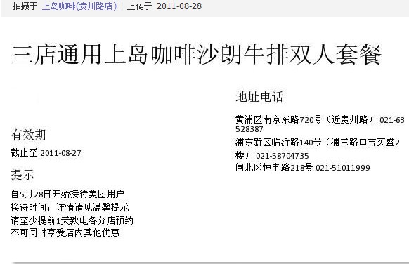 又是一个团购的~牛排套餐,话说要预定原来是有原因的~牛排菜单上都没有的…………是需要准备~说是沙朗~吃不出来,反正我是觉得还不如吃豪享来的更好呢上来的时候就觉得卖相不好,不是整块的牛肉,中间有筋膜隔开小块小块的~切也切不断~用嘴巴咬的:(还好不是约会,要是的话还不糗死了~沙拉里面,80%以上是土豆~汤是温的,味道不喜欢~其实就薯条吃着还行吧咖啡也没像其他人说的那样好,自己加奶和糖~有点淡淡的吧服务一般,进去的时候有问了冰激凌餐前还是餐后上,要了餐后~吃完了之后让她们上冰激凌~结果是几个服务生都站在一起聊天八卦,其中某个冲着那边吧台的人喊“**桌的餐后”,她们几个一动不动~几分钟后还没有上来~再来一句“**桌的餐后”~过了几分钟才上~~~冰激凌很冰,觉得冰的成分太多了,都能感觉自己在吃冰块了……没有香草的一点点香味……反正是很失望就是了~应该不会再去的了环境一般,有点昏暗,洗手间没去,据朋友说很脏~…查看更多
