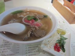 感觉这家的越南牛肉粉很好吃的啊。 全名叫做:越式火车头牛肉河粉。 其实吃完了,我还是没搞清楚为什么叫做火车头。 反正里面的料超级多。 包括:QQ的米粉, 生牛肉,熟牛肉片,牛筋,牛肉丸,牛肉汤还有豆芽和一点用于点缀的香菜。生牛肉很新鲜,粉色的均匀分布。 牛肉丸子很Q弹。熟牛肉是有咬劲的,牛筋也弹牙。一碗米粉,我一个女生连着汤都吃完了。 还配了一杯香兰味冰。 这个喝起来有点薄荷的味道。比较清口。 店里很干净。 装饰着一些绿色的饰品。 感觉很清新自然。…查看更多