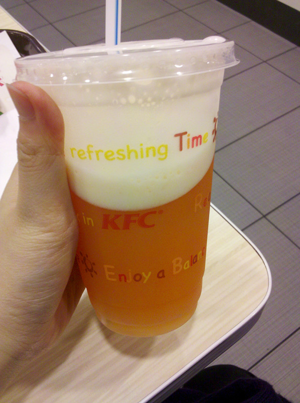 从芳村客运站搭车外出,买的票要等比较久,还好站内有KFC可以吃点东西~KFC在候车室里面,要安检才能进去的。而且是要上一条很长的楼梯才能进里面,对于拉着行李重物的旅客来说确实不方便,所以还是比较少客人去吃的。买了九珍果汁飞冰和老北京鸡肉卷,九珍果汁装得比平时的要满,不过感觉泡沫很多哦~鸡肉卷嘛还是那个味道,有点甜有点辣,鸡肉还是比较多的,一个下来刚好饱肚~KFC里的店员比顾客还多呢哈,服务超好,走的时候还给我拉门~…查看更多
