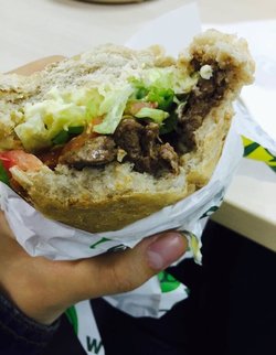 赛百味的三明治吃过很多次啦,想吃金枪鱼被告知没了,后来吃了牛肉的,里卖弄的牛肉有种烤牛肉的感觉,牛肉粒蛮大的,感觉自己好像还吃到了牛筋呢,口感超级有弹性,放了好多色拉酱和番茄酱,生菜很多,吃多了肉再吃吃菜,荤素搭配,营养健康。…查看更多