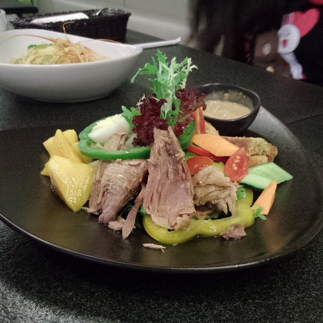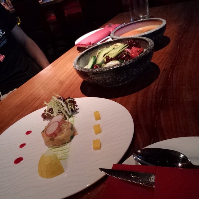 三星完全是给的环境跟服务 餐厅周的菜式真的不怎么好吃...预定了四人位 没有四人桌 只能坐长桌了..不会主动上水 跟服务员要了才给的一杯冰水..三文鱼塔塔 像肉饼的感觉有没有.! 切成小碎片压在一起 吃不出三文鱼的味道..田园沙拉 看起来还不错 用的黑醋汁 居然还有牛油果 挺清爽的..番茄汤拌绿罗勒 番茄本来是很开胃的 这汤喝的我有点恶心 味道太淡了..三文鱼宽面 三文鱼是熟的 看起来还是很有食欲的 一吃就又一吃失望 确定不是直接水煮了上盘的吗 吓得我赶紧跟店员要多了几碟番茄酱拌着吃..蓝带猪扒 薯条好吃的多 猪扒比较中规中矩 不会像上面吃的那样..比目鱼 咸死我了 真的 他们家不是淡死就是咸死 可以中和一下吗 芝士薯泥好吃..水果沙拉 就是哈密瓜苹果火龙果焦糖炖蛋 虽然很甜 但是觉得是这顿饭里最好吃的一份了 味道很浓郁..…查看更多