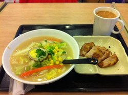 屯京拉面他家是日式料理店,基本是比较家常的,比如日本煎饺和拉面,我点了一份,食材很多,汤的颜色很深,可能放了味增什么的,有一个蛋,切成两半,笋,猪肉,海苔等,口感还不错的,很有弹性的拉面…查看更多