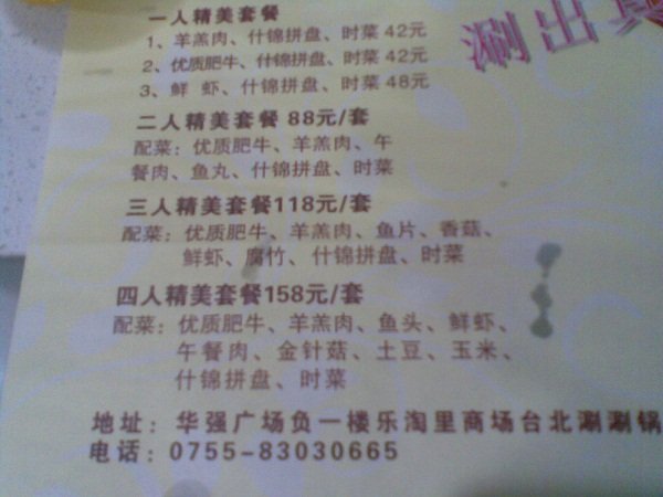 更有约好在华强吃饭··这里位置和环境看起来还是不错的·还有自助调料区··就定了来这里吃··结果大失所望·锅底虽然是免费的·但也未免太淡了吧·还好调料是免费自主的··只能狠拿调料拌着吃咯我们算了一下套餐·其实还没有单点划算·所以点了一个单人套餐·其余的是自己点的·三个吃了150多·…查看更多