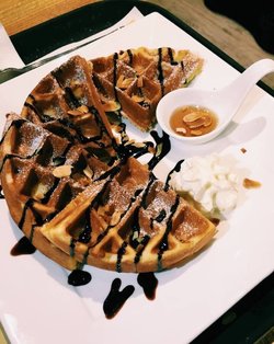 在南京西路这家zoo coffee喝下午茶,环境超级嗲,喜欢这家店的玩偶啊,很新又很萌,朋友不断在那里玩自拍呢,比利时华夫饼和之前吃过的一些都不一样,是现做的,口感温热,但是是软的,有点软曲奇的感觉,奶香味还是很浓的,巧克力酱很厚实,两个人吃刚刚好。…查看更多