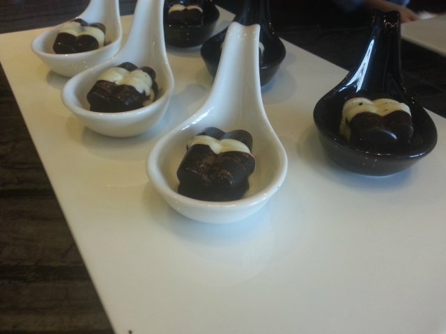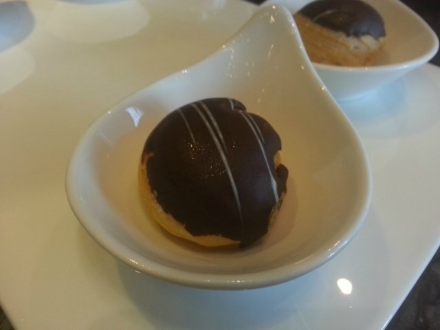 第一个吃的是巧克力,巧克力的味道还算浓郁,因为冻过,所以口感稍硬一点点,个人觉得不是很甜,还不错,毕竟我就喜欢吃巧克力,哈哈这个没试,听别人说貌似不错,我吃的是另一种差不多的,蓝莓芝士蛋糕,加了点蓝莓酱的,口感很滑,很绵密,芝士味很浓,带点蓝莓的味道,有点微微的酸,所以吃起来不会很腻。泡芙,这个是我最喜欢的,酥皮因为也是冻过,而且制作和外面不太一样吧,偏硬一点,外面大多是酥软,这边的是酥脆,所以感觉比较特别,里面的奶油很香滑,配上外面脆脆的皮,还是挺搭的。