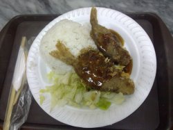 店面很小的一家餐厅,里面的座位非常拥挤,夏天在这里吃饭吃得全身都是汗,而且卫生环境很差,地面很油,走路的时候觉得特别滑脚。周一至周五每天都有一款特价套餐,不过很快就会卖完。烧汁仓鱼饭10元一份,有两条仓鱼,仓鱼味道一般,不是很入味,中午吃一份饭基本上都足够饱。…查看更多
