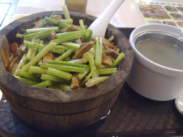 “一桶天下”顾名思义这家餐厅是吃木桶饭为主,木桶饭的种类非常多,虽然都是川菜,但是可以跟服务员说不要辣味。芹菜香干饭的卖相一般般,味道还可以,做得比较入味,11元一份,中午吃这个已经足够饱了。还配有一碗萝卜汤,不过味道有点咸,而且野不是新鲜熬制的。…查看更多