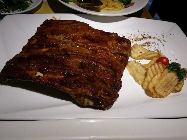 西餐厅来的,算系亲民的价钱,反正也就不贵,晚上等位系肯定的,好多年轻人过来撑台脚嘛。烤猪排,这个分量真系非常的有诚意的,原条的猪排,撕着吃非常过瘾,肉挺多的,结果吃不完,要打包走了。不过这个不是新鲜的排骨肉来的,所以肉的味道不是很香,只有调味料的味道,但调味做得还可以的。…さらに見る