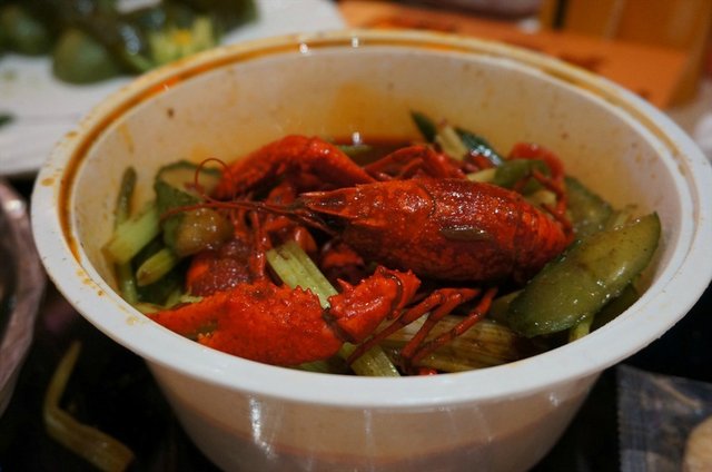 某美食网年会的赞助商之一,提供每桌两盒小龙虾,一盒有7、8只,还配给每个人一套吃小龙虾的工具,有一次性手套、防止溅到身上的一次性围裙、纸巾、牙签等。打开后看到酱汁很红,一股香辣味扑鼻而来,虾的个头算比较大,还有芹菜、青瓜等配菜,因为本人怕辣,所以没有品尝,其他人吃完觉得味道还可以。…查看更多