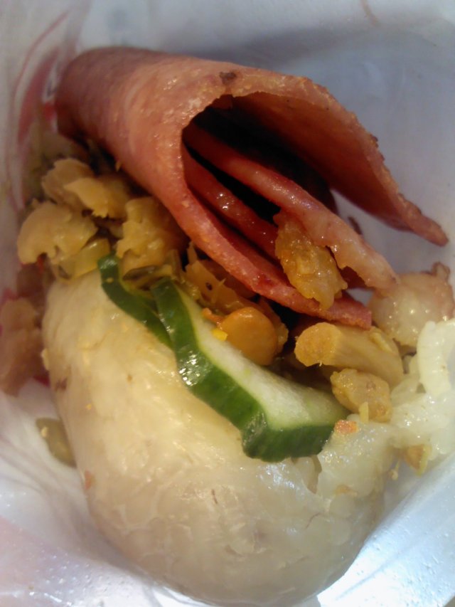 做大肠包小肠的小食店,也有这款台湾著名小食的变身“大肠包火腿培根”,相对没那么油腻。可是味道真的不怎么好,不值10+的价格,尽管店家有搞优惠活动,比如正价点一份大肠包小肠,指定饮料免费畅饮,可是仙草茶寡淡无味,不值一试。…查看更多
