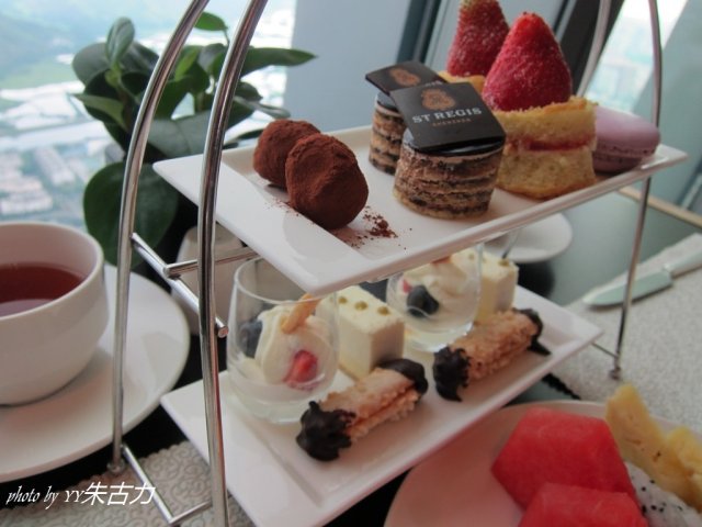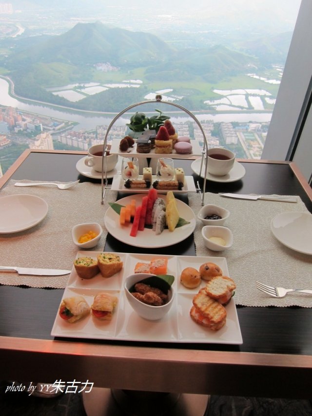 之前在微博上就有听说过这家餐厅..一直就很想来..很多人都说这家餐厅不能订位..只能直接过去..而且如果晚去了就没位置了..这家餐厅在京基100大厦的96楼..还是第一次来到这么高的地方呢..果然..一去到就没位了..但是服务员态度很好..说96楼的位置已经坐满了..所以只能带我们去楼下去了(95楼哦)..他们说因为来96楼下午茶的人很多..为了满足更多的客人需求..所以就租了95楼的下午茶时间了..哈哈..never mind..只相差一层楼而已哦..我们刚坐下来就给外面的风景给吸引住了..长这么大还是第一次坐在这么高的餐厅里一边欣赏风景一边喝下午茶..真的很舒适哦..我们看了看菜单..有2个经典的套餐..一个是西式的一个是中式的..还有一些单点的食物..看了看吃的东西..最后选择了西式的套餐..¥198..+15%服务费基本上每样食物都是2份的..而且也很精致哦..服务员会问我们喝什么茶?有红茶跟绿茶..而且都是免费续杯的哦..服务员看到我们杯子的茶快喝完了..会主动过来帮我们添..而且茶都是热的..很贴心..我第一个吃的是那个紫色的小饼干..但是还没到嘴边..小饼干就划掉下来了..T_T5.5.5...我只能坐在位置上看着那个还躺在地上的饼干了..为了不让经过的人踩到而滑到..然后就找来了一个主管mm帮忙收拾一下..没想到主管mm知道我们掉了一个..过了一会竟然拿了3个粉红色的小饼干过来了..哇..一赔三丫..值了..主管mm太人性化了..赞一个..这个小甜品..味道也不错哦..小小个..很精致的...这款小甜品印象挺深刻的..不知道叫什么名字(只知道它长得像3筒)..但味道不错哦..入口即溶..有点疑问的是最上面的那3点小圆点到底是什么酱?吃起来怪怪的..有点像某种植物的汁..真的很好奇是什么酱料?who can tell me?这款东东面包很硬丫..真的吃不习惯..但是中间的那层虾还不错哦..虾的肉很厚很大只..也很新鲜..为什么就要跟硬面包混在一起..?!我个人觉得这个也不错..有种淡淡的咖喱味..面包软软的.跟咖喱配合在一起挺好的..最适合我这种不喜欢太浓的咖喱食物..这个套餐的食物味道总的来说还可以..但食物的价格..我个人觉得不值¥198咯..我想..这里的风景加上这里的环境..还有服务跟食物还是值得偶尔来奢侈一下的..毕竟能上到96楼来坐个一下午..环绕着深圳的风景..舒适的环境..再加个下午茶..还真不错哦..如果要来的话..真的要提前来..因为我们坐在95楼..只能坐到5点就要埋单了..毕竟这是人家95楼租给他们的..如果坐在96楼的话..坐的时间可以久一点..而且还可以360°观赏深圳的风采哦..本来还想奉上一张在96楼拍摄地王在自己眼下的照片哦..但是想想还是算了..毕竟要自己亲自看到的才会更美哦..!!…查看更多