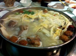 和朋友一行三人去的,刚好是三人行。点了带肉的三人锅。三人锅里是没有金针菇的。有肉圆,笋片,豆腐百叶,几片肉和12块大骨头。服务员说是10块左右大骨头的。我们比较幸运哦。骨头实在是太多了,带肉的确实很多肉,我们三个吃到最后还剩了3块。实在吃不下了。肉煮的有点过,但是用料确实很实在的,满满的一大锅啊。钵钵鸡也蛮好吃的,比在一般川菜店吃的要香,分量也更大一些。凉拌木耳味道一般般,不过解腻。酸梅汤也是解腻的么,就也点了一份,因为广发5月之前是首个100减50的,3个人下来只吃了189,还是蛮划算的。…查看更多