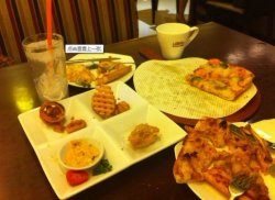 今天去吃的下午茶,点了拼盘披萨,饮料有续杯,不过续杯的速度很慢,第一杯喝完了,等了很久,服务员才来续杯,态度一般。觉得鸡翅比以前吃的都好吃,可能是因为非常烫的关系,有汁水,入口口感很好。披萨上面的材料很多,火腿,和肉满满的,味道很好,芝士味很浓郁,而且一点也不腻。。蛤蜊汤,觉得还不错,汤很浓很鲜,不过吃了很容易饱。我们2个女生,最后都么吃完,只好打包回家。哈哈另外,这家店的交通很方便,乘地铁,路过就进去吃东西了。…查看更多