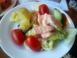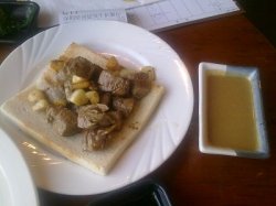 相对实惠的午市套餐 廚房制造 2011-03-10偶尔才会来吃正餐,相对牛扒的质素,性价比实在不高。也经常看到红酒族在这里聚会,六百多一份扒一下子叫几分吧。这种大店就是丰俭由人啦。午市套餐倒是经常来吃。像午市的双人套餐,主菜有三文鱼两块,炒花枝若干,牛肉若干。另外配了炒饭,小菜,汤。三文鱼一般,挺小的两块。炒花枝也因为比较油,感觉一般。至于那个牛肉,炒得倒挺香的,不过老了一点。特别的倒是垫在牛肉下的那块面包片,吸收了牛肉汁,反而很好吃,吃得快打起来咯!蔬菜水果沙拉任吃,品种还比较多。要真是吃肉吃不饱。。。就。。。吃菜吃到饱呗。。。…查看更多以上食評乃用戶個人意見 , 並不代表OpenRice之觀點。1分享相对实惠的午市套餐 廚房制造 https://s.openrice.com/KtbT0W0ttG000檢舉 張貼 評分3味道3環境3服務3衛生3抵食