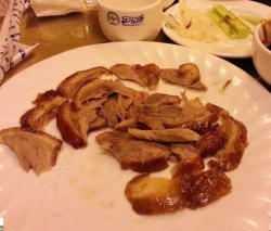 年前第一次去,可能快要过年的缘故吧,好多人都回家了,所以饭店显得很冷清,我们是晚上7点多到的,只有2、3桌客人。点了烤鸭、糖醋里脊和干锅土豆片,上菜速度还是很快的。普通烤鸭88元,口味一般,不是很出彩,但是我很喜欢那个酱,很甜很好吃。两盘肉,一份葱,一份酱,真抠门!糖醋里脊,过甜,外边的面太厚不酥,吃起来很像在吃面。干锅土豆片,下饭菜啊,就是少许有些辣。…查看更多