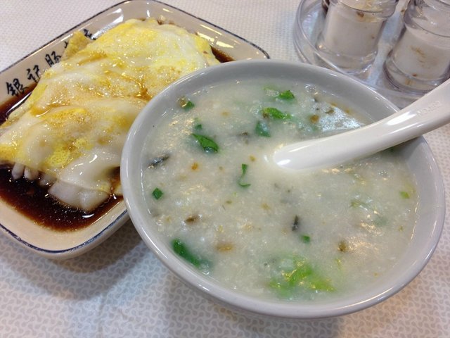 银店是有许多间分店了,客村这一家环境一般般,不过生意极好。不想做饭的时候喜欢来这里吃上一碗粥,外加一碟肠粉。皮蛋瘦肉粥很绵很好喝,其实用的是中碗,份量也不多不少。鲜虾肠粉稍贵一些,更推荐这里的鸡蛋瘦肉肠,加上粥才十来元钱。水是自助的,要自己去倒。也有蒸饭类的吃,一般都是15元钱左右。…查看更多