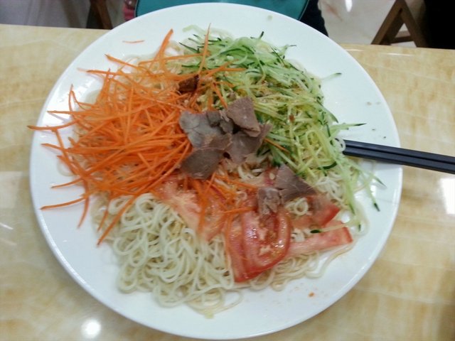 店面不太大,几张桌椅,四周贴着食物简介,简单干净,有时候,太多的装饰反而会引起杂乱,店主个样睇起来几祥和,一直笑眯眯的。点了这个不记得名字的粉,第一眼睇上去,五颜六色的,一下子就提高了食欲,红的胡萝卜,青的青瓜,还有西红柿和牛肉,单从营养学上讲就是搭配不错的了,另外苗条够韧,还有伴了食醋,酸酸的,口感很好。…查看更多