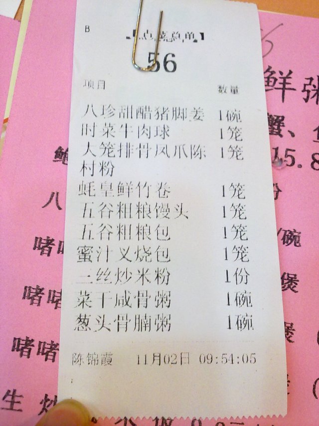 这里早茶、下午茶都挺抵吃的啊,早上11点前结账和下午2点至5点都是点心打五折。这里小点5.5元,中点8.5元,大点9.8元,特点11.5元,顶点14.8元,超点17.8元,精点20元,还有优点25元。这里还有加一服务费。大笼排骨凤瓜陈村粉(优点):真的不错,粉挺滑嫩,排骨也挺多的,我觉得比单点排骨好吃。全都是肋排八珍甜醋猪脚姜(17.8元/碗):猪脚酸酸甜甜的,吃多了就有点腻,醋是甜甜的。三丝炒米粉(大点):有点咸。五谷粗粮包(大点):棕色的,里面有莲蓉,甜甜的。五谷粗粮馒头(中点):粗粗的,味道我不感冒。最失败就是点了两碗粥啊,那粥都没米的,全都是水。那粥还是顶点呢…さらに見る