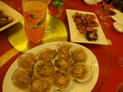 公司的晚会选在这个酒楼办了,我们在大厅摆了二十桌,刚刚好。看完表演都8点了,大家肯定比较饿。先给我们上了个潮式卤水拼盘,众人齐下筷,一夹一试,咦!有的放下筷子,在等别的菜上,有的继续夹,味道一般般哟。美极基围虾:虾算大的啦,在虾背开了一刀,看到虾肉,非常吸引人,香。柴紫菜蚝仔汤:蚝仔有沙子,汤也没什么味。鲜核桃妙百合木耳:木耳好脆口,百合鲜甜可口。蒜茸粉丝蒸元贝:超爱吃的,但粉丝很短很短,元贝很小一个。还有其他的菜,铁板牛仔骨,菜干腩肉煲,虎皮尖椒炒猪颈肉,青瓜蒸鲳鱼,芹蒜豆干仔炒腩肉,上汤浸时蔬。人虽然蛮多的,但服务还是蛮周到的,服务员不时倒酒。叫他们拿什么速度也蛮快的。…查看更多