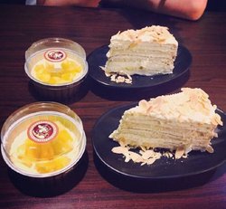 和朋友去吃的榴莲千层蛋糕,蛋糕一上桌就能闻到一股淡淡的榴莲清香味道哦,特别好闻,吃上一口的时候榴莲味道很浓郁的呢,蛋糕口感比较松软的那种,蛋糕和榴莲层层次非常的突出呢,一个吃完都觉得还没吃够呢,最赞的是吃完后嘴里有浓浓的榴莲味。…查看更多