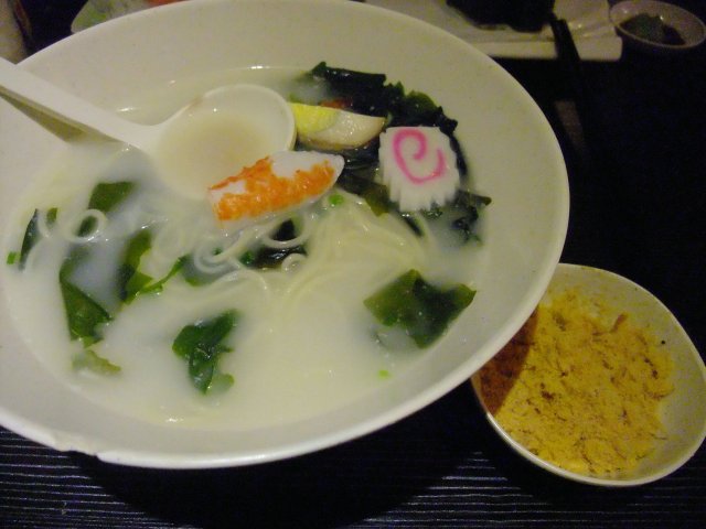 之前团了个双人套餐,69元的。午餐就在这里解决了。店的面积不大,就只有五个卡座,四个四人座位,一个回转大台。我们一坐下就很快上了两个指定果汁,两个味噌汤,汤底偏咸,就只有几小粒豆腐和海藻,喝了两口就作罢。点了一个鸡扒饭和一个肉松拉面,上桌的速度是蛮快的。鸡扒饭是不怎么样了,鸡扒少得可怜就只有小拇指大小的几粒肉,根本不饱肚。 肉松拉面是可以的,虽然味道淡了点,份量还是蛮多,配的肉松也不少,我一个人食一个面几乎食不完。套餐配的刺身就两个品种每个三片,三文鱼和希鲮鱼,都算厚切吧。不过后来我们另外点了个店内的刺身三拼,三个品种每个五片,这个58元,明显比我们的团的份量多好多。另外配送的10个寿司,不过不失吧。69元的价钱,OK吧,要求不要太高就可以了~~…查看更多