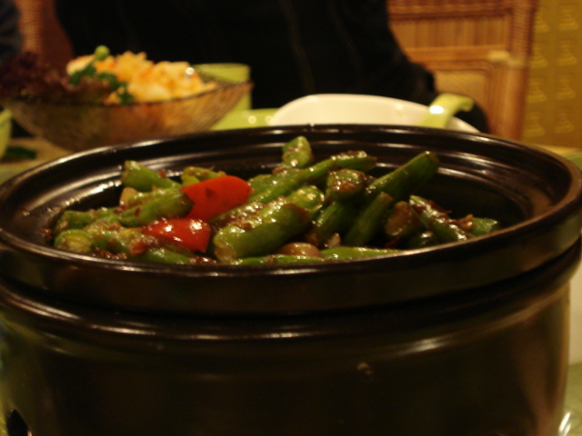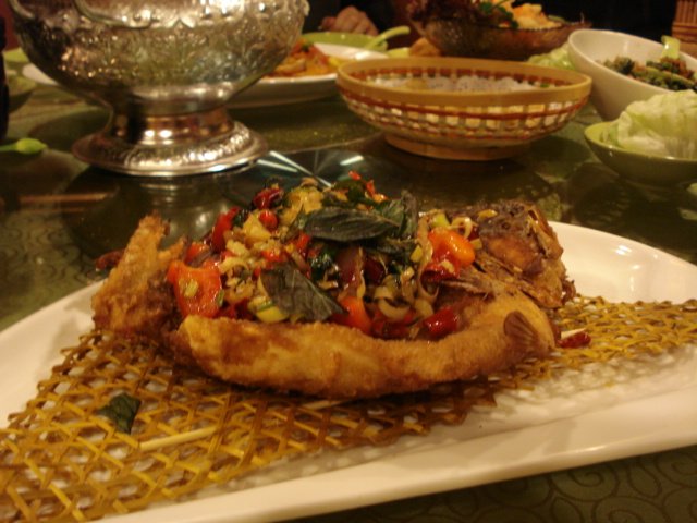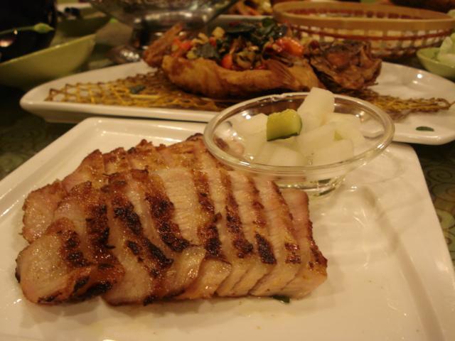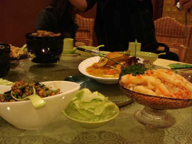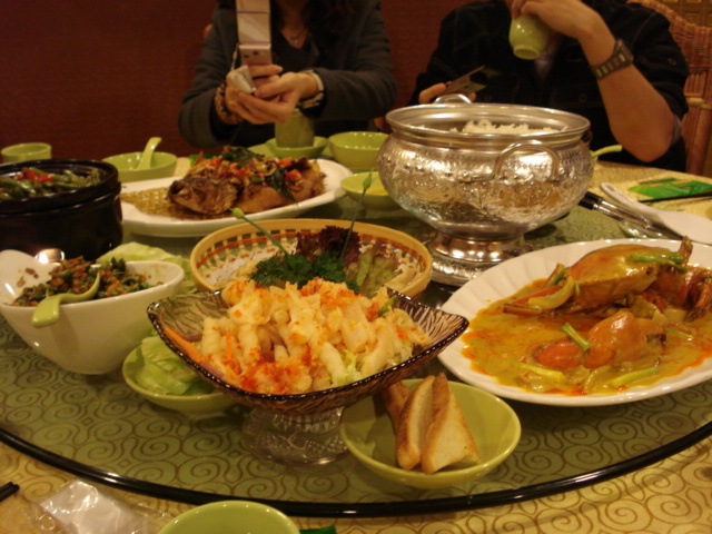 双拌木耳沙律类似凉菜,味道很酸,印象深刻阿。 泰式酸辣凤爪几爽口,酸酸辣辣的味道刚刚好。 招牌冬荫功汤里面的虾大大只,肉质不会绵,挺韧的。 皇牌咖喱炒蟹有很多咖喱,鲜浓的咖喱最适合捞饭啦,还搭了面包可以蘸咖喱吃。 招牌猪颈肉好正,肥瘦适中,弹牙,和香芋竹烧富贵鱼是这次我最喜欢的两道菜。 香芋竹烧富贵鱼得到大家一致赞誉,鱼的表面烧得很脆,过了差不多一小时也没变软。 三巴酱四季豆用小锅装着,里面一直在加热,四季豆很入味哦。 泰式鱼香茄子煲味道也是在小锅里,全程吃都觉得热辣辣,味道同粤式的差不多,很合口味。 香芋生菜包鸡配了一些生菜,自己用手包,我是不配生菜的吃法,也挺好吃,配饭很香。…查看更多