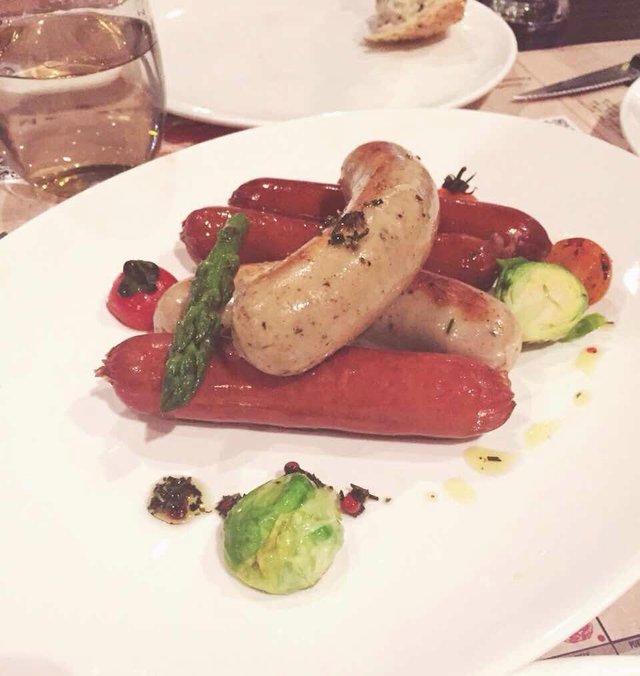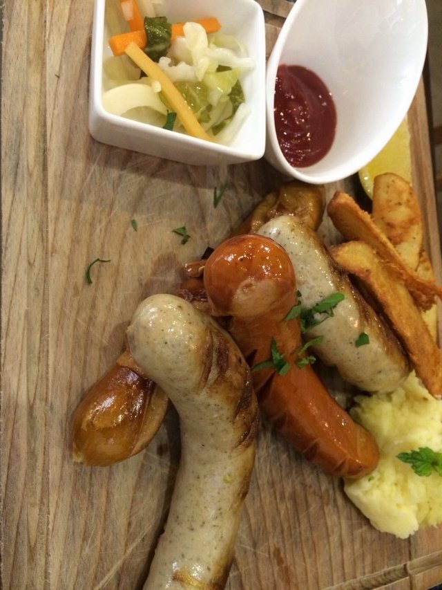 新开的一家餐吧,最近才留意到。刚进去的时候觉得没有餐吧的那种气氛,几个服务员集中在一起,我还以为是茶餐厅呢,环境也还算有特色,坐下了才发现原来有二层,二层比较小,很隐秘。菜色跟一般餐吧的没什么不同,这里的爆菊鸡一直想试试看。点了香肠拼盘,分量确实很多,看上去就四条肠,实际上很能饱。边边的薯角味道不错!有番茄酱。还有咸酸呢!香肠有四种味道,一开始我还以为只有两种,黑椒味道的挺好吃,千万不要手贱挤柠檬汁!真的好难吃!芝士味道的很腻!这里的意粉煮的太硬了不好吃!不推荐红酒鸡翅,完全不知道什么味道!…查看更多