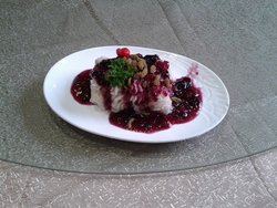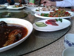 朋友请客去的,店面很大,环境很好,单间宽敞,我们十几个人一点都不挤。服务员上菜挺快的,蓝莓山药,山药上面浇的蓝莓酱,酸酸甜甜比较开胃,孩子很喜欢,清蒸多宝鱼,鱼肉新鲜,萝卜苗。上面浇的橙汁,有点辣,水煮牛肉,肉挺多,也很嫩,最推荐的是他家的烤鸭,尤其是鸭皮,烤的脆脆的,一点也不油腻,这家店的菜量不小,价格应该不便宜,请客还是很有面子的。…查看更多