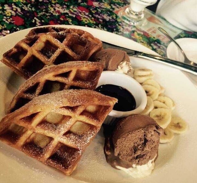 第一次来这家吃的下午茶,人不多,环境走的是小资派路线,巧克力香蕉华夫饼味道不错的,华夫饼做的很脆口之外,水果香蕉也是点睛之笔哦,口感饱满新鲜,巧克力的冰激凌球比较小,唯一觉得有欠缺的就是酱料没有事先洒在华夫饼上,动手蘸着吃有点小麻烦。…查看更多