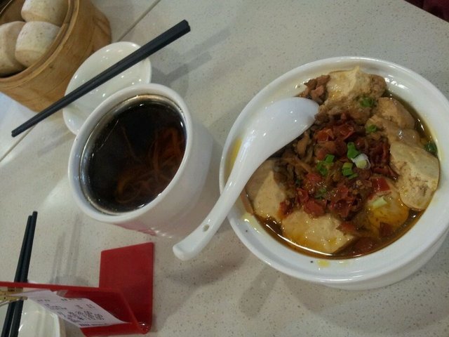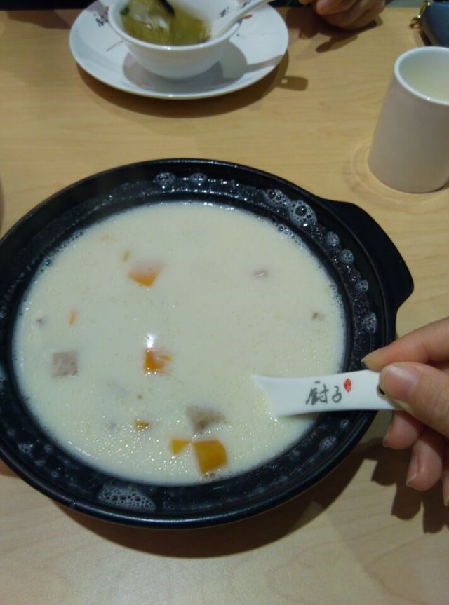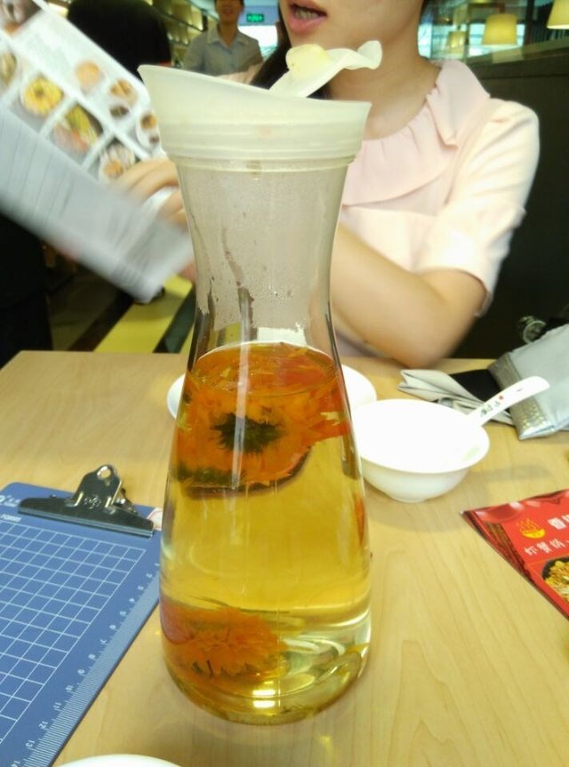 。每桌都会花茶,据说不要花茶可以少5块,个人觉得还是喝点花茶比较好。里面除了明显的菊花之外另外还有其他的一些花茶,喝起来淡淡的香,不会很浓郁。就是玻璃平太烫了,到的时候很容易烫到手。椰汁香芋南瓜有点咸有点甜,味道甜,味道比较好,说是椰汁其实味道更偏向于奶味,南瓜和芋头都切的很小颗,不过芋头没有想象的那么粉,总体来说还不错!遇上有折扣去吃就很优惠,如果平时去的话价格还是小贵!…查看更多