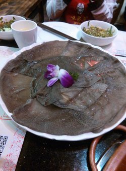 参加那个海参斑一鱼三吃的活动去的,蹭的,之前想的无限高大上啊!下午4点多到的,店里就一桌客人,到我们自己坐下服务员才过来,期间一直站在那里……之后表明来意,然后去隔壁验证,隔壁看着环境更好,不知道为什么没人去,有一对人去了,又给引到我们这里来了服务员没有给上茶水,还是我们主动要的,才给,上菜挺慢的,等了差不多半个多小时,无聊时拿了她家菜单看,菜单弄得像海报一样,说说菜吧!先说鱼,这个深海鱼,鱼皮挺厚的,鱼皮的口感有点像是海参,软糯的那种,肉呢,有些像是瘦肉的感觉,有点劲道的说,刺是软的,感觉像是中间是空空的,看图片这鱼挺丑啊,奇丑!!!!先是一大碗粥,味道偏咸,里面的鱼肉很少,还给了一碟蔬菜,也没说怎么吃,反正我给拌到粥里了然后上来一个砂锅,感觉像是干锅的做法,特别咸,而且很腻,里面放了挺多的洋葱什么的用来解腻的,看来是知道很腻嘛!不过那个皮倒是烧的挺脆的最后一个是豆豉蒸海参斑,用了一个长条的像鱼似的盘子装着,这道菜能充分体会到这个鱼为什么叫“海参斑”了,口感和海参非常像啊!这个味道还算可以,至少不是咸的,不过还是觉得腻啊网上说这个价值400多,到店里一看写着特价98元,差挺多哦!如果这要400多吃这个那真是冤大头,3个人吃不饱不说,而且也不怎么样,就尝个鲜,即使是特价也不值!而且呢,整个下来,除去口感不错外,整体觉得腻,没吃饱倒是被腻得不想再吃了另:免费试吃里,额外收取每人3块钱的餐位费…查看更多