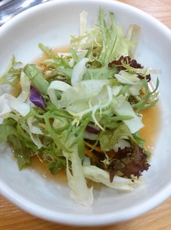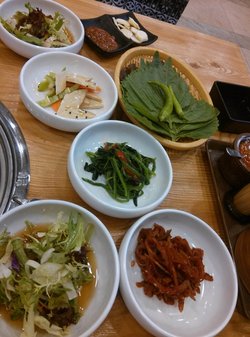 看到美团上的团购就团了一份双人餐,进店之后,里面是暖暖的黄色系,店内也很暖和,服务员都穿着短袖拖鞋,衣服的颜色也挺鲜艳的呢!先是上了一堆乱七八糟的小菜,有一个是几片树叶,带毛的那种,有点硬,喇嗓子的说……选了B套餐,因为有拌花菜,(*^__^*) 嘻嘻……拌花菜,刚吃的时候有点辣,不过吃着就好多了,没有想象中好吃,能给个3星吧秘制肥牛,量不多,但是够吃,味道还不错,可以给个4星半五花肉酸菜,外观不错,肉还蛮厚的,肥瘦相间的圆肉片,量不多,酸菜呢跟肉没有一毛钱关系,这个额外放在锡纸上烤的,烤一会儿就可以了,不然就糊了,烤的时候服务员也有提醒,说是酸菜是熟的别烤太久了,酸菜没有味道,酸!烤鸡胗,可以吧,没什么说的,给4星烤地瓜片,这个烤不好,不是糊了,就是没熟,好不容易有个不错的,吃不出来味道,地瓜片啊,里面的水分都烤没了……~~~~(〉_〈)~~~~茶:韩式的大麦茶,这个看到是从一个加热的大壶里倒出来的,我很喜欢喝,喝完之后服务员又给加了一壶主食选的是炸酱饭,我觉得还可以可以给个4星了,但是朋友却觉得不好吃,外观丑了一点,黑乎乎的他家的酱有麻酱和海鲜汁,一块钱一份的,一般般吧,感觉烤肉还是吃辣酱好点服务,服务员一直溜达来溜达去的,会主动帮你烤肉,拌饭什么的,可惜咱不是那种主子命啊,服务员给我们烤的时候各种不习惯啊,然后就跟服务员说【谢谢,我们自己来吧】服务员放下夹子,然后没一会儿,看到我们碗里没有肉了,就又过来给我们烤了……实在是太热情了,不足之处就是:有的服务员面无表情啊(我是不是太挑剔了??)…查看更多