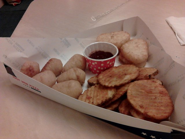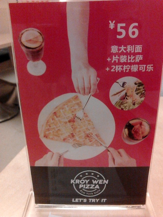 2012年5月27日,偶然路过时尚天河,就俾一间有着特别嘅名字同类似宜家家私装饰风格嘅pizza店吸引——KROY WEN(稞粒吻),源自纽约传统风味的比萨品牌。由于当时新开,于是店家就打出免费请食pizza嘅广告。出于好奇,就睇咗下店里边出售嘅pizza,发现呢度嘅同pizza hut嘅唔同,系薄底的,除此之外,貌似冇乜特别,所以冇乜兴趣。后尾睇咗网友嘅点评同推介,就同朋友结伴去尝试。第一次去,已经系7月8日嘅事。当时点咗一个双人套餐,一共56蚊,有一块片装pizza+一份意面+2杯柠乐。本来系要芝士焗意面,不过当时只有秘密意面,就唯有要秘密意面。芝士pizza,好似叫布鲁克林,pizza底又薄又脆,成个pizza铺满芝士,入口满满嘅芝士香,对于芝士控嘅我,根本系难以抵挡嘅诱惑~呢个系一个意外嘅惊喜。因为当时只有呢样,出于无奈唯有选择佢。意面嚟嘅时候,睇落冇乜特别,就系沙律+意面。沙律系用醋嚟拌,所以食落酸酸地,好开胃。上面撒咗D芝士粉,混埋一齐食,酸中有D芝士香,而且非常清爽,同布鲁克林意外嘅夹(因为布鲁克林系纯芝士,食多会觉得有D腻)。广州嘅夏天非常闷热,秘密意面绝对可以刺激食欲。柠乐,就系柠檬+可乐,冇乜特别。之后去咗几次,都系点56蚊套餐。上星期再去嘅时候,发现好似升价了,56蚊嘅套餐冇咗,取而代之嘅系65蚊嘅9寸pizza套餐,1份9寸pizza+1份稞粒吻沙律+2杯柠乐。甜心pizza:四周系酥皮,中间放了D水果,酥酥甜甜,整体口感比较甜,唔系太中意,不过酥皮pizza几得意。加点嘅薯角,35蚊一份,全部都系用薯仔整嘅。右上角嘅薯饼,食落同麦当当嘅有D似,香酥脆;左上角嘅,食落有D甜,软软的,唔系咁中意;下边圆形的,有DD辣,非常香脆,呢个一定要尽快食,因为放耐咗会淋。店里边有洗手池供客人洗手。PS,呢度嘅服务态度很好,因此用餐过程会非常愉快~…查看更多