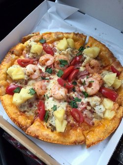 上次吃了以后觉得真的是非常好吃的,吃过最好吃的pizza了,馅料又足,口味又棒,南京目前有两三家吧,这次点的是金牌夏威夷,周边的卷边是芝士加红薯,味道不是很甜,里面的馅料很足,虾仁都是很大一颗,吃起来QQ的,培根也很嫩的,菠萝酸酸的口感,中和了油腻,非常好吃,绝对的赞。…查看更多