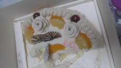 老爸过生日,提前一天电话预定的,第二天中午11点去取的,12寸的,差不多30cm,10人左右吃,258元,外面一层奶油是加了可可粉,所以看上去不是很白,味道还不错,不会吃起来很腻人,可可粉中和了一下,上面的水果口感也不错,挺新鲜的,中间蛋糕是有水果夹心的。…查看更多