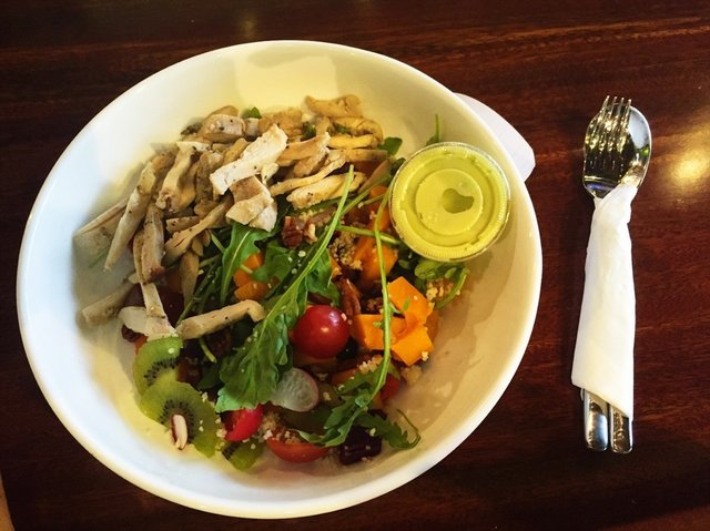听说今天中心城的沙拉店可以拿五块糖换北非库斯小米彩虹鸡肉沙拉~刚好要去罗湖就顺路过来了。这家店在外围,乐卡尼的边上…店内不大,却能恰到好处的摆放很多座位~墙面上还有他们老板的海报给五颗糖给服务员拿了一根香蕉~再拿着香蕉去换沙拉,沙拉很快就上了,分量挺多的,里面有鸡肉,南瓜,番薯,小米,萝卜,圣女果,核桃,蓝莓!还有不知名的不好吃的蔬菜叶。总的味道还可以…Read More
