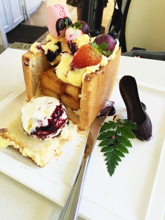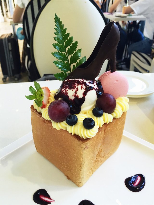 lady 7这家店开了很久了,从去年就被柠檬网炒得很火,看图片觉得还不错,但是一直没机会回来吃。在这个烈日炎炎的下午,我来到了欢乐海岸(友情提示,大下午没什么事还是不要来欢乐海岸了,实在是要晒的中暑了…欢乐海岸没什么树的说)这家店位于蝴蝶梦的后面,就是在所有房屋的最里面。白色的门窗,白色的桌椅,很有童话中的梦幻般的感觉,服务员身穿黑色短裙,黑色长筒袜,白色衬衣,很是舒服~点了高跟鞋吐司~过了十分钟左右就端上来了,服务员提醒我说,拍照完之后可以让她帮忙切~整个吐司都很精美,一个吐司上面涂满了cream,点缀了蓝莓,葡萄,树叶,马卡龙,雪糕,还有高跟鞋状的巧克力。拍完照之后就叫服务员来切。服务员先把高跟鞋巧克力取下,然后把吐司的一侧切开,最后将一块涂满了奶油的吐司放在了我盘子里了。我尝了一块,热热的刚烤出来的吐司,裹着凉凉的冰淇淋,还有甜甜的口感很厚实的cream,很好吃。吐司的味道还不错,马卡龙相对于吐司来说就有点差强人意,马卡龙有点散。还有做装饰用的高跟鞋巧克力味道也如我所料,一般般,感觉像是廉价巧克力做出来的。总的来说还可以啦,服务态度不错,做的也很精致,味道也不错。不过以后我绝对不会冒着烈日再跑过去了…Read More