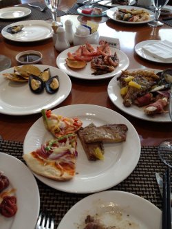 团购自助餐,每人88元,中午去吃的,其他吃自助餐的店的都差不多价,但是今次在酒店吃,服务好过其他自助餐多多声啦,环境又好,坐得好舒服,好静,我觉得呢个价好抵! 食物方面,由于场地没甘大,品种比其他自助餐厅会少点,不过主要噶品种都有,好似10几种中菜,螺,虾,三文鱼,羊扒,牛扒,煎鱼,粥粉面,汤,牛腩,八爪鱼,寿司,匹萨,各式小蛋糕,炖蛋,雪糕都有. 由于人少,拿食物都没甘辛苦,去其他自助餐真是好似打仗甘,呢度的食物拿完一轮一阵就会再上,吾惊没得吃,八爪鱼我吃了好多,平时超市几块就要几十元了,我拿了一大碟,呢度都吃翻够本拉,,,呢度中有服务员帮你换碟,而且他中好细心,你坐低后,他会每张凳都套个套,防止你的衫或袋整邋遢,同埋防止人偷野.食物材料足,服务又好,好过果d咩自助餐好多啦!!!…查看更多