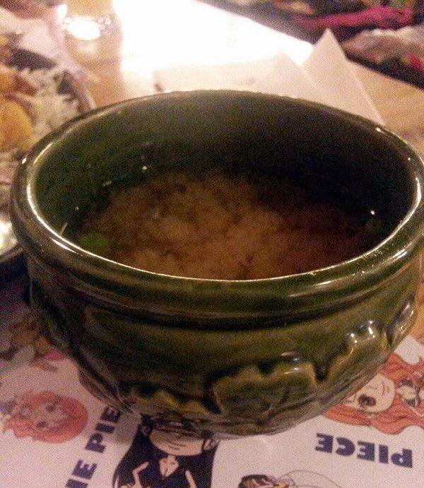 老公很喜欢海贼王,知道十里堡这边有这家店,周末就来吃了,我们中午来的,人不多,店里到处都是海贼王的装饰,还有很多珍藏书籍呢。他家的味增汤做的不错,10元一盅,也就一人份的,酱香的味道很浓,里面还有酱的那种沉淀物,很好喝。…查看更多