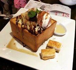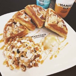 作为一个资深的韩剧迷怎么可能错过mangosix的美味呢,爽蓝柠檬汽水,芒果椰奶都是经常吃的,最感兴趣的就是香草焦糖华夫了,感觉最实惠了,华夫饼有一点软软的,吃起来口感和传统的优点不太一样,冰激凌球带着浓郁的奶油味道,上面的杏仁片超多,太好吃了,还有巧克力甜酱哦。…查看更多