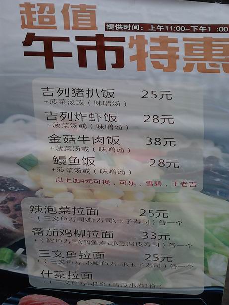 团购去的,太划算了,69元能吃很多款东西,我和小孩2人吃不完。店面干净舒服,对逛街来说,是歇脚的好地方。我们吃了三文鱼寿司,鱼很鲜,鲷鱼寿司很好吃,天妇罗卷就是虾了,还可以,什菜天妇罗就不要试了,就是用地瓜、芋头 、茄子粘上面粉炸,不咸不甜不好吃。主食是泡菜拉面,紫菜拉面,份量足呀!…查看更多