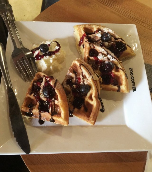 Zoo Coffee现在竟然也出团购餐了,不过还是觉得他家的价格贵了点,味道是挺好吃额。华夫饼是这里的招牌了,各种味道其实都是差不多的,就是一些配料不同而已,我挺喜欢蓝莓华夫饼的,华夫饼烤的很松软,看起来是挺硬挺的,上面的蓝莓果酱不多,味道已经足够重了,还散发着浓浓的奶酪味道。口味淡一点的就是水果华夫饼了,这个没有加任何的酱料,就是搭配了一些新鲜水果的而已,算是原味的了。…查看更多