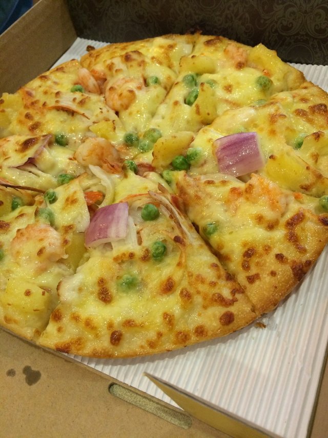 团购的尊宝比萨蛮体贴的是支持配送,所以在家也能吃到热腾腾的披萨了。套餐中饮料换成了大瓶装的可乐,还有赠送了尊宝比萨的专用披萨环保袋。海鲜披萨味道还可以,海鲜分量蛮多,虾仁好吃,其他的味道都有些淡,芝士分量足,不过不够香。搭配鸡米花、鸡软骨、薯条等,每人两片就蛮饱了。味道价位都是蛮大众化的,生意也不必必胜客差。配送时还送了积分卡,积满7张可以换一个10寸的披萨,手上只有两张,还需努力。…查看更多