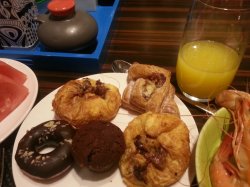 我每到一个地方都会特别留意卫生间,因为细节之后更能体现服务的品质,这边的卫生间除了男士、女士之外,还有一间,虽然不知道是为哪一类人群准备,但是体现了一种人文关怀。接下来就是食物了: 海鲜类:虾很大、也很新鲜,推荐螃蟹个头很大、肉很鲜美也很紧实,强烈推荐蟹腿有一种被水泡了很久的感觉,虽然还是很有弹性,但是没有什么味道,不推荐各种贝类,因为我不喜欢吃,所以只吃了一个尝了一下,沾上小料味道还算不错,都是煮熟了放在冰上面冰镇的甜点类甜品种类超级丰富,从各种面包、蛋糕到布丁、西米露,真是大饱口福面包虽然不是刚刚出炉的,还是还是很新鲜,浓郁的香味蛋糕好多种:黑森林味道很浓(推荐) 芝士蛋糕没有米旗的颗粒细腻(一般)坚果蛋糕里面都是很实在的桃仁、长寿果(强推)还有一个蛋糕不知道叫什么,一碰就碎,但是味道不错(推荐)布丁:焦糖布丁太腻了,一般般吧,巧克力布丁非常好吃,口感细腻柔滑,就是吃多了也腻椰浆西米露:这个椰浆超级纯,不是一般的好,强烈推荐饮料类普通饮料:有果粒橙之类的纯果汁饮料:冰箱里面的纯果汁饮料超级赞,拿了一个菠萝汁一个不知道是什么的,大爱咖啡:有一个自助咖啡机,很多选择呢正餐类选择了牛排、牛肉派、南瓜饭、芝士通心粉牛排不是全熟的,肉很嫩,虽然味道很淡,但是牛肉的香味可以被充分品尝到(很赞)牛肉派:有点腻了,面应该使用油和面的,吃着腻南瓜饭:一般般吧芝士通心粉:这个很棒,芝士给的很多,通心粉里面还有肉肉,大赞 蔬果类蔬菜沙拉品种很多、调味品种类也很多水果有猕猴桃、哈密瓜、西瓜、冬枣、香梨等等这次大餐真的是相当的享受餐桌垃圾还有服务员及时帮忙倒掉虾蟹贝类补充的速度也很快来这种餐厅吃的不是食物,而是享受!…查看更多