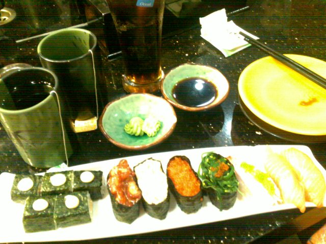 挺久之前团购了一份19.8元的单人寿司套餐,有7款寿司和一杯可乐寿司有三文鱼寿司两个、肉松小卷六个熟虾青蟹子、红蟹子、芝麻八爪鱼、海草蟹籽、吞沙寿司各一个感觉材料还是挺新鲜的,但是饭团比较大,料稍微有点少另外在钱库机打印了一张寿司优惠券,寿司一律5折加送一杯可乐跟朋友两个人去吃,另外点了大概20元的寿司有特价的黑碟寿司,味付八爪鱼寿司和味付螺肉寿司一碟3个才8元人均大概20元每人有一杯可乐,而且寿司吃得还挺饱的,感觉挺划算的不过感觉服务比较一般,而且店内地方比较浅窄,坐得不是太舒服…查看更多