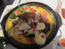 团购的。性价比OK, 服务也不错。 紫凤蛋皮马兰卷(1例,价值28元)这个上面添加了很多鱼子,咬在嘴里,咯吱咯吱的,里面好像是荠菜+色拉酱。做冷菜吃,味道不错。- 蜜汁桂花糖藕(1例,价值22元)这个和别的地方做的差不多吧。决定是没有22元的价格的。热菜:- 招牌一锅鲜(1例,价值98元)这个不错。 很大的一个锅,都赶上一个脸盆了。里面有蟹,蛤蜊,蚌,虾,土豆,海带,汤也很鲜。- 秘制花雕鸡(1例,价值48元)打开盖子,就有浓郁的香味飘出来。是一个童子鸡吧,鸡肉满嫩的。2个人吃正好。- 手撕包菜(1例,价值22元) 味道还行。他们家上菜挺快的。也没有什么额外的消费的。 满好满好。 …查看更多