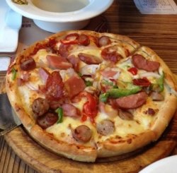去过一次,感觉里面环境不太阳光,有点暗,人还挺多的,但是口味很一般,披萨还是不错滴。海鲜焗饭里面海鲜忒少,吃多了腻人,不过蛮合我胃口的。虾卷里面的虾实在是少,不划算,吃了玩吧。奶酪拼盘也是少的可怜。很不幸的是吃完了之后我胃疼了一天,感觉不是很新鲜。 …查看更多