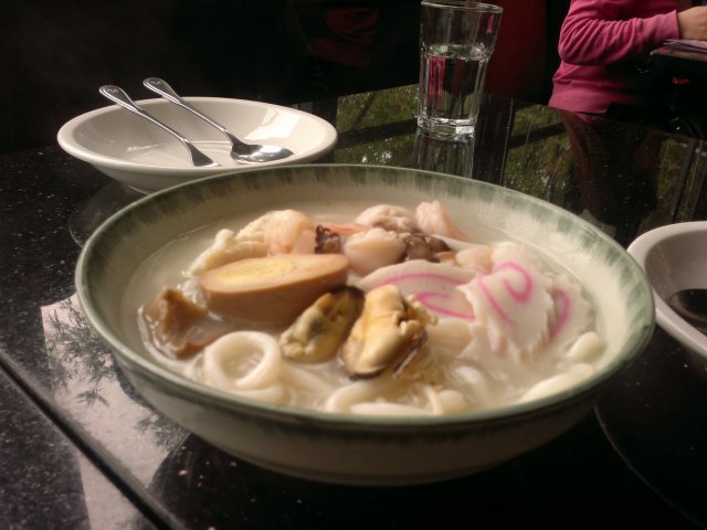 春节期间,我们一家去爬白云山,中午选在这里吃饭。餐厅分室内、室外两部分,外面可以欣赏到白云山的风景,不过已经坐满了,我们只能坐在室内。好在窗户超级大,也不影响我们欣赏窗外的风景。来这里吃饭的人不算太多,还有空位。春节期间加收20%的服务费的。服务员态度一般,感觉有点木。菜上得有点慢,估计人手不够吧!我吃了一份海鲜乌冬面,很大的一碗,其实分量不算太多。海鲜挺新鲜的,虾很嫩,小墨鱼很入味,口感很爽滑;卤鸡蛋很入味,咸淡适合。面条很粗,很有弹性,很有韧性,嚼起来口感很好,只可惜分量少了点,就那么几根。…查看更多