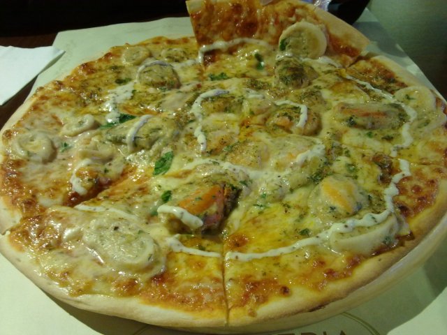 话说之前抢到奶油海鲜PIZZA5折卷,便找了个周末和朋友去试试的说。 中午一点多到,2楼就只剩两个空桌给我们选。坐下当然点了个奶油海鲜PIZZA啦,怕不够又加点了个吞拿鱼脆条。 吞拿鱼先上,外面的面包烤得脆脆的,味道还不错,等多一会PIZZA终于上了,热腾腾的,带上手套就不客气了。成个的海鲜青口,虾,一口下去满满的满足感,最爱这种被美食塞满整个嘴的感觉。味道的话其实感觉还好 ,不会说特别的好吃,但店家下的料的诚意是绝对的。有机会的话还会来尝试其他。2楼的环境还不错哦。…查看更多